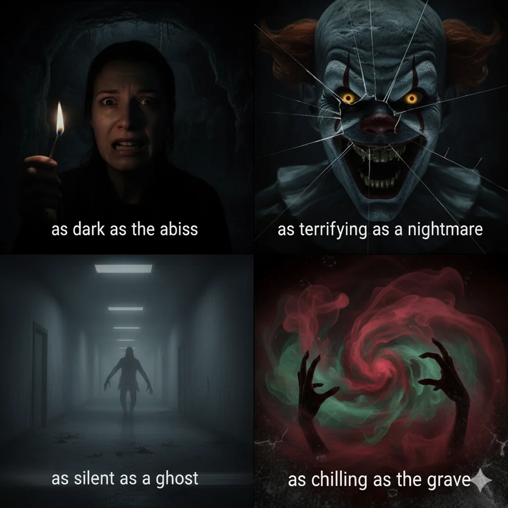 Similes are figurative comparisons that use the words “like” or “as” to paint vivid mental images. They turn simple sentences into expressive, emotional, and memorable moments. When you’re describing something scary, similes allow readers to feel the tension, atmosphere, and fear that the words alone cannot fully express.