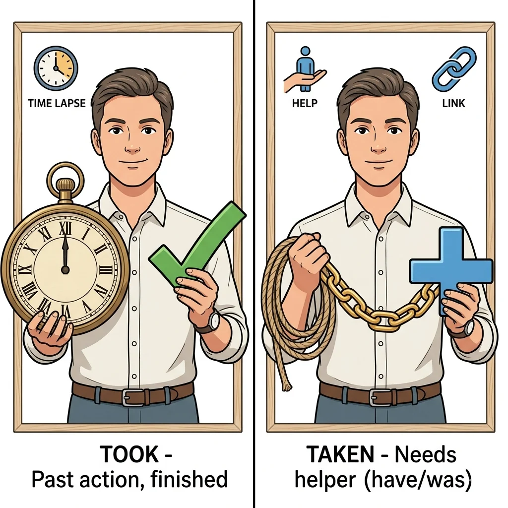 You now have the full answer to taken or took. Remember the one simple rule: Took stands alone. Taken needs a helper (have, has, had, was, were). Do not say have took. Do not say was took. Say have taken and was taken. This small change makes your English sound professional.